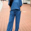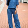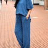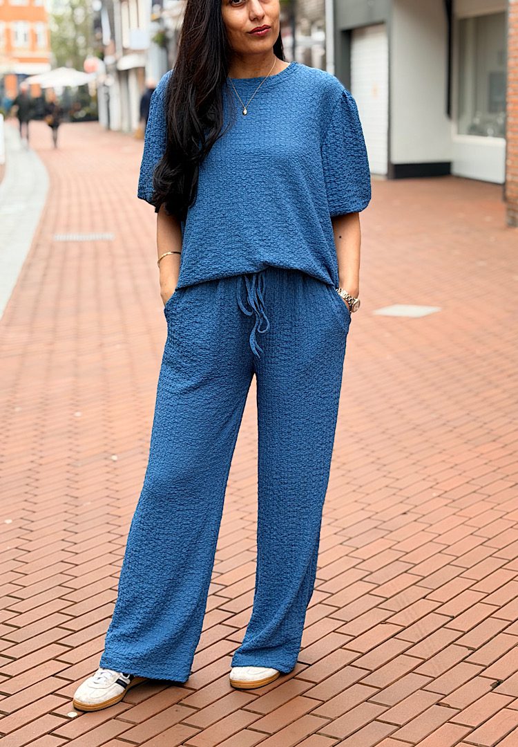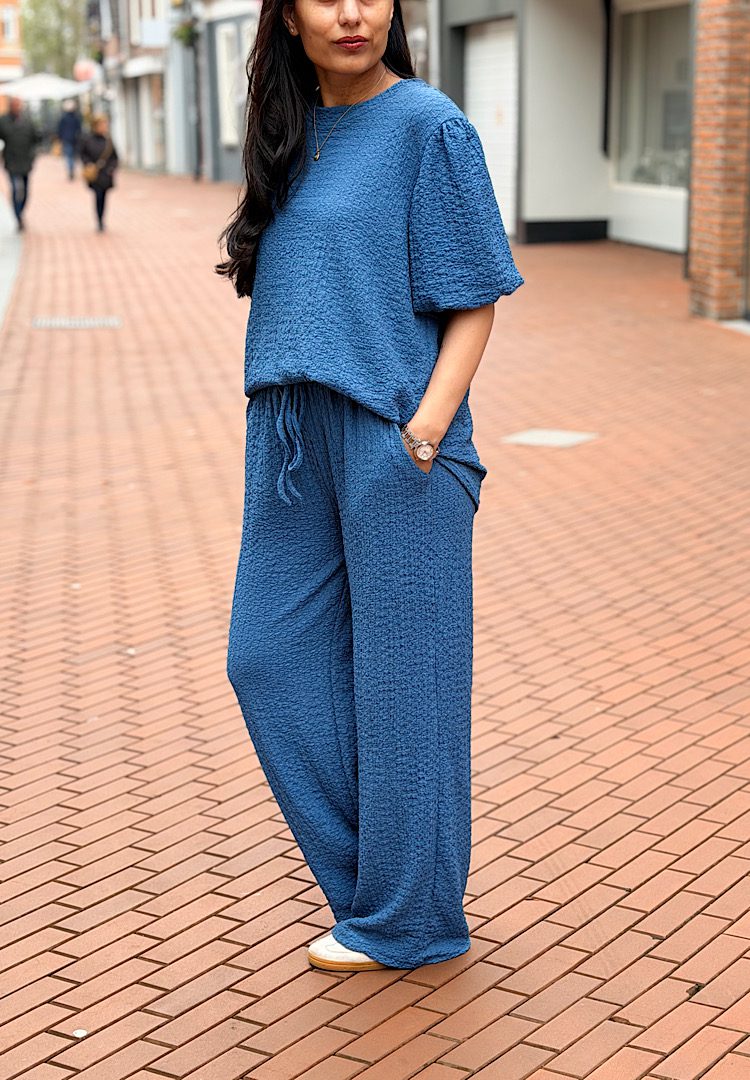 Stijlvolle set van luxe structuurstof met een perfecte balans tussen comfort en elegantie. De top heeft een ronde hals en gevoerde pofmouwen; de broek is voorzien van een elastische tailleband met koord.