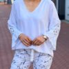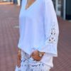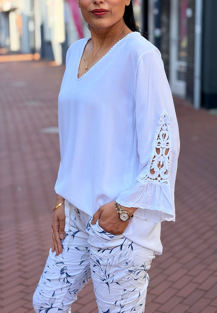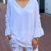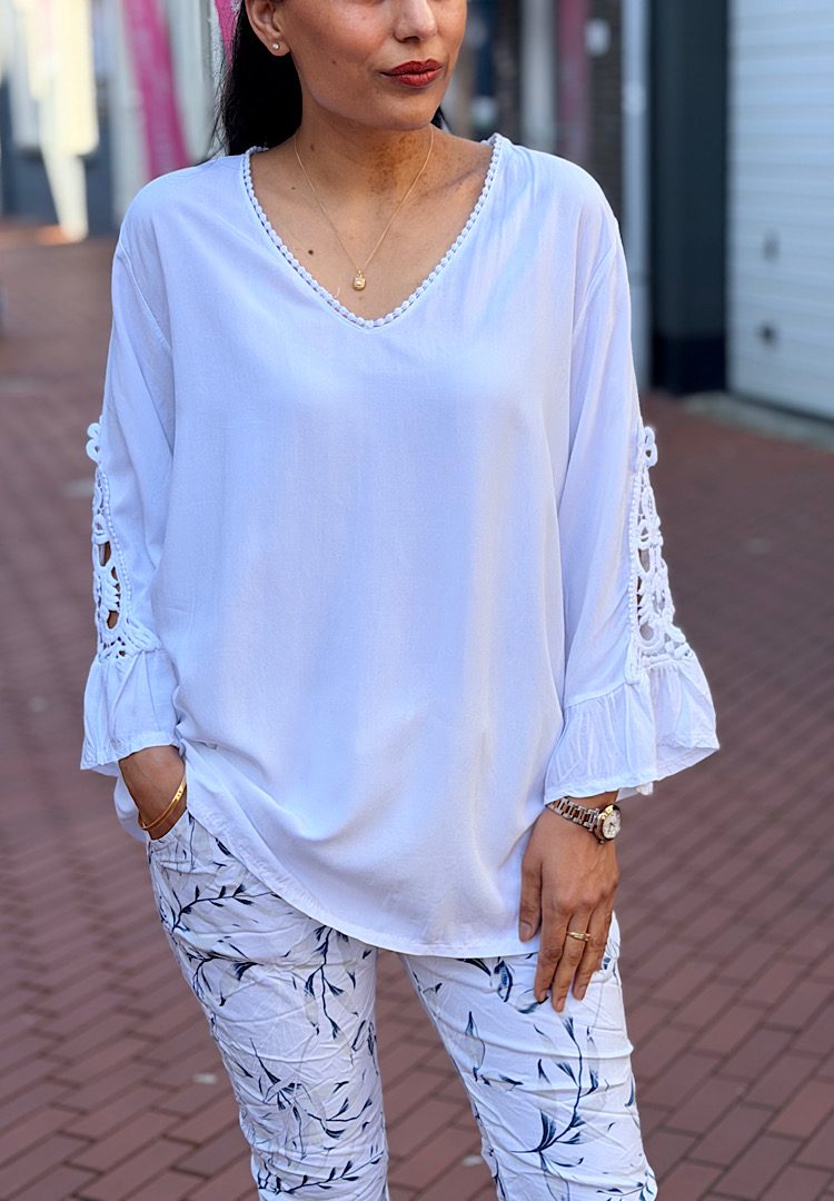 Geef je garderobe een dromerige touch met deze prachtige blouse. Afgewerkt met verfijnd kant en heeft opvallende, uitlopende mouwen met speelse ruches. Dankzij de luchtige stof en de elegante V-hals is dit de ideale mix tussen vrouwelijk en comfortabel.