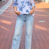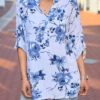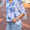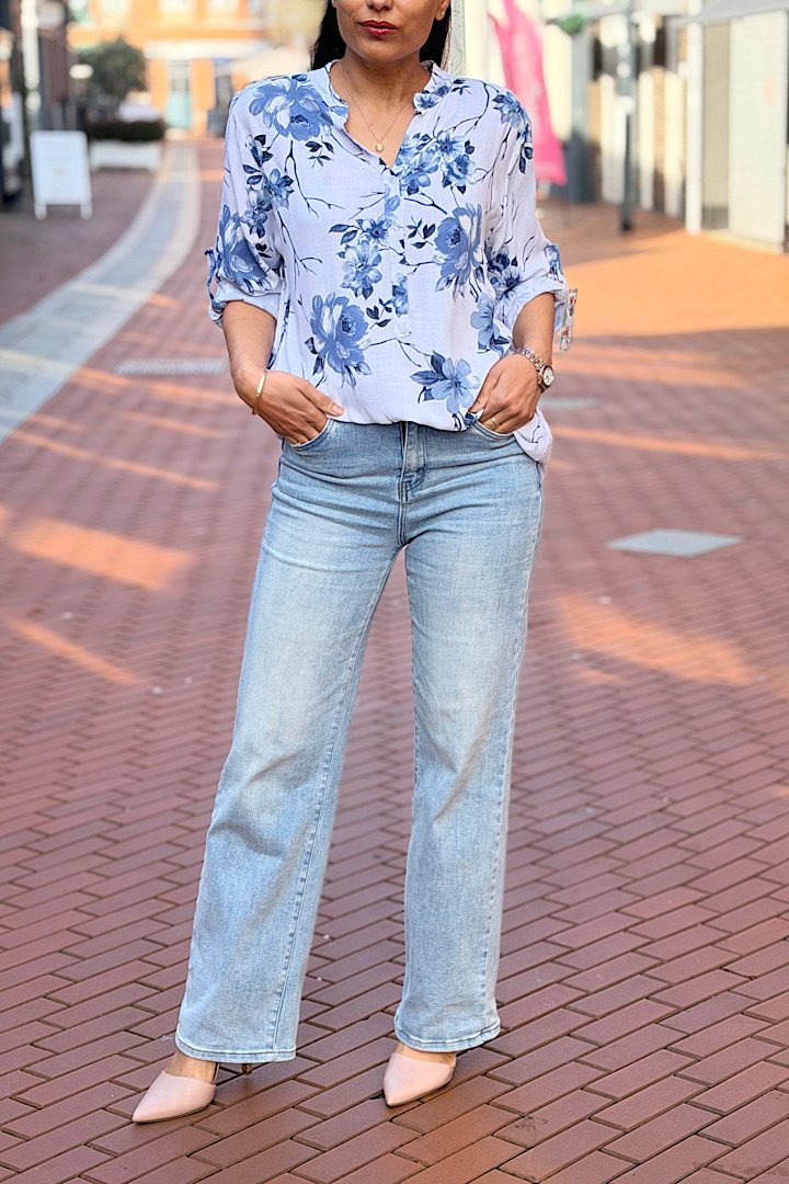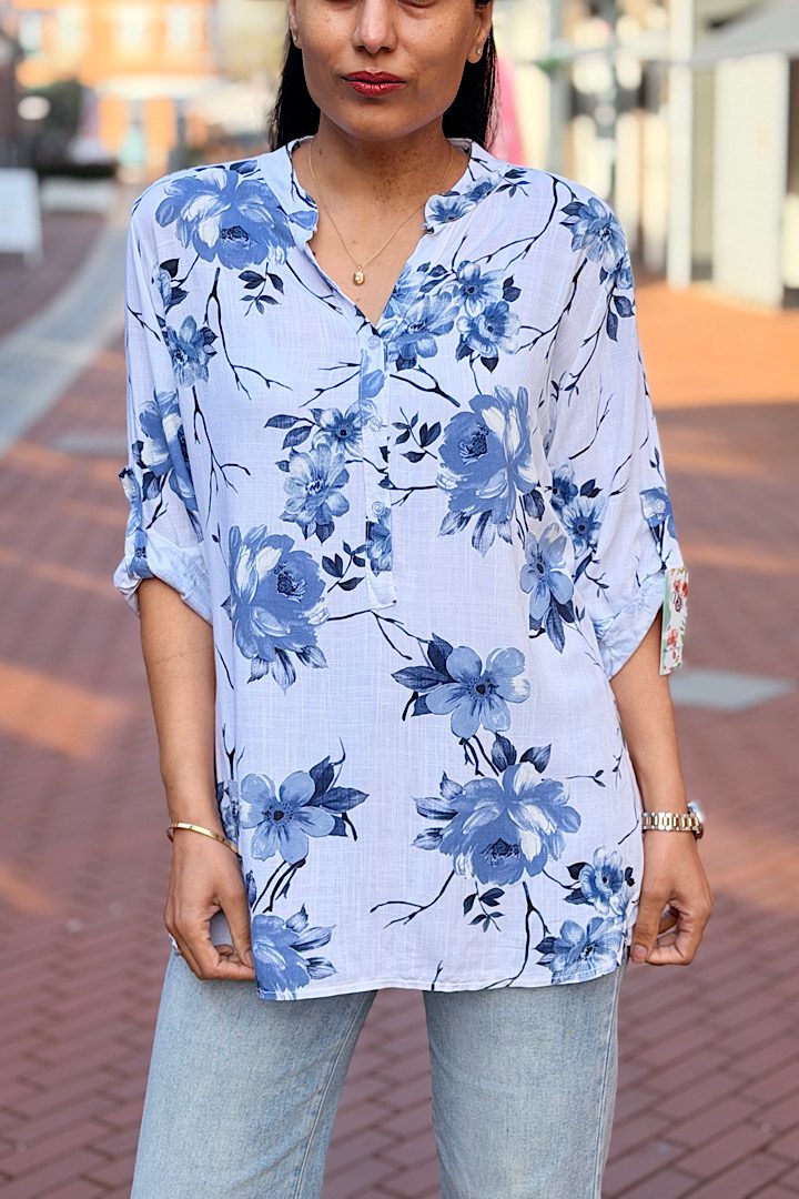Licht vallende blouse in 100% viscose met opstaande kraag en V-hals, knopen aan de voorkant, en driekwart mouwen met handige ophaalknop. One size geschikt voor maat 36 tot 40.