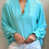 De blouse is geschikt voor maat 40 t/m 46 en valt bij kleinere maten mooi oversized.