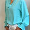 Deze one size blouse met ruffle aan de kraag is een stijlvolle toevoeging aan elke garderobe.