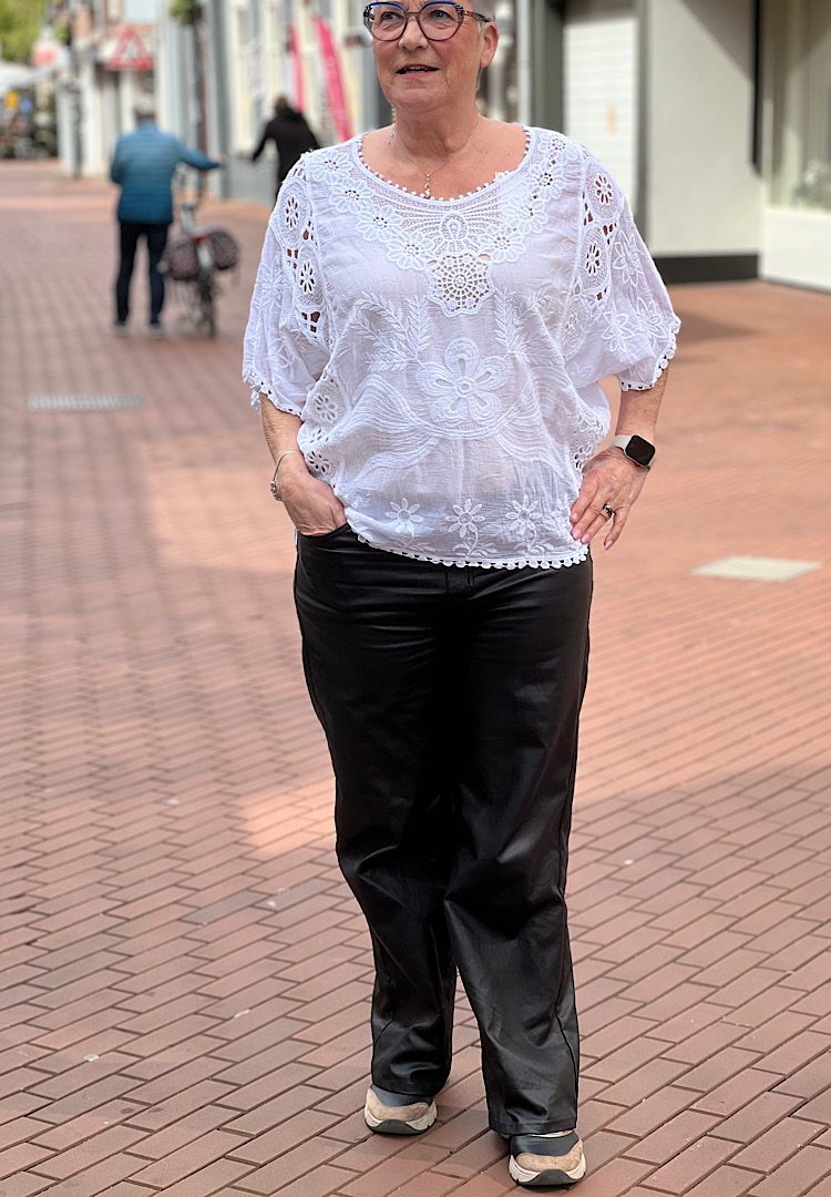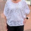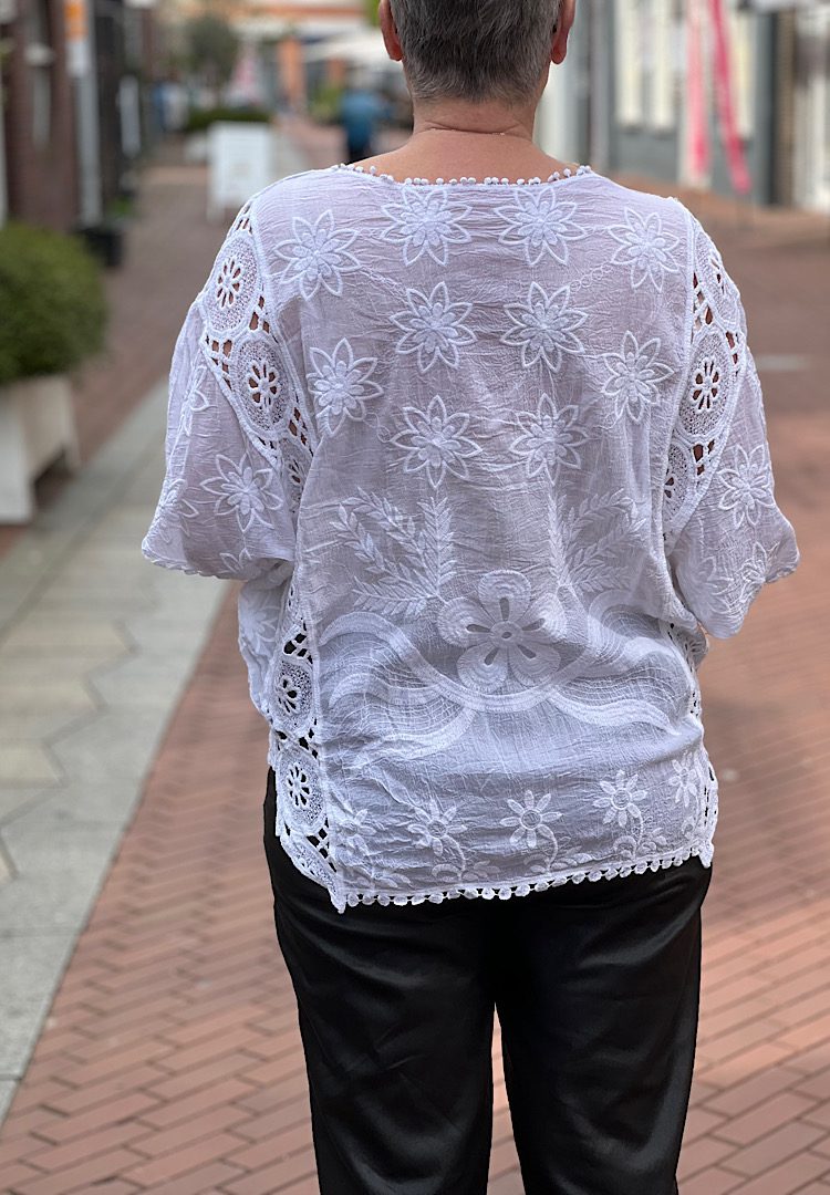 Deze super mooie kanten bloes is nieuw in de shop. De blouse heeft korte vlindermouwen en een variërend kanten patroon over het gehele item. Kan zowel met een jeans als met een mooie rok of iets dergelijks gestyld worden.