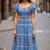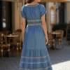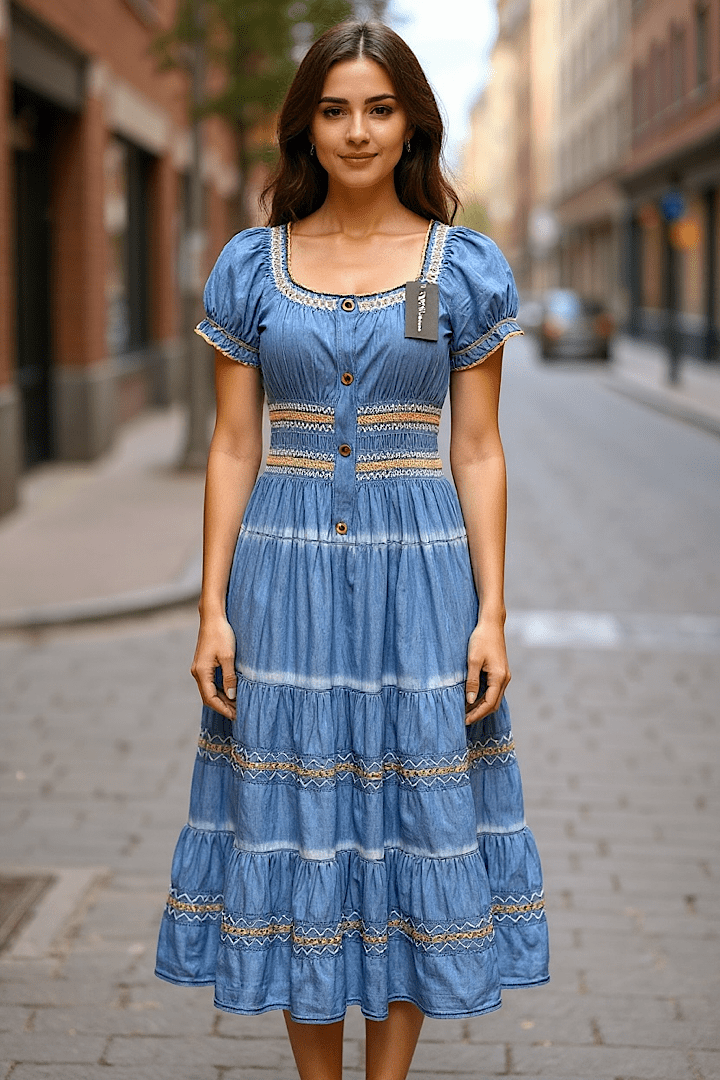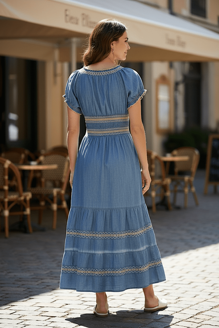 Detail: Lange spijkerjurk, A-lijn, Korte raglanmouwen, Elastische halslijn en manchetten, Gelaagde geplooide zoom, Brede gesmokte elastische tailleband en 4 sierlijke knopen.