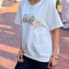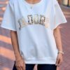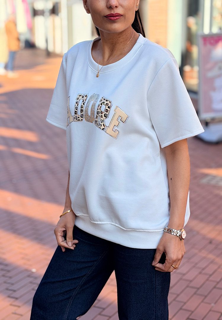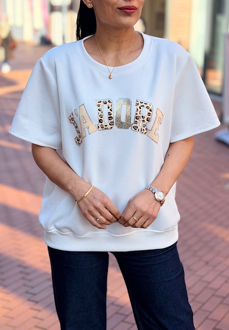 Trendy shirt van boterzachte jersey stretch met ‘J’Dore’ opdruk afgewerkt met steentjes. Dit model heeft korte mouwen, een sportieve boord aan de onderkant en een stijlvol high-low effect (achterzijde langer dan voor).