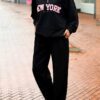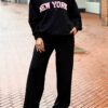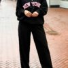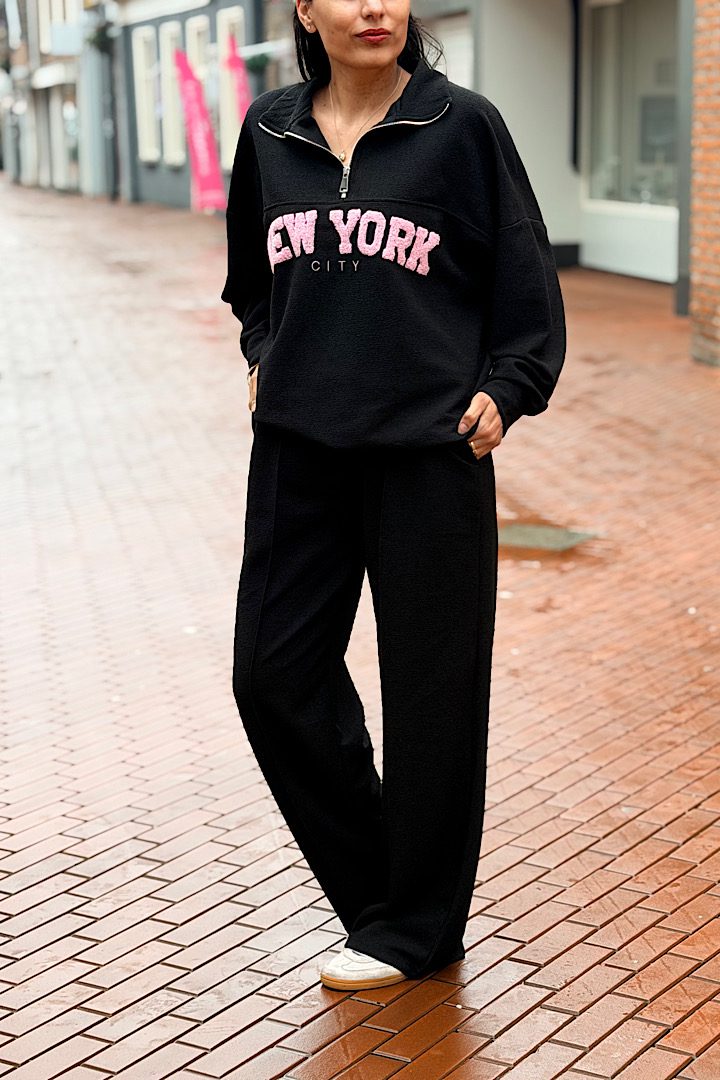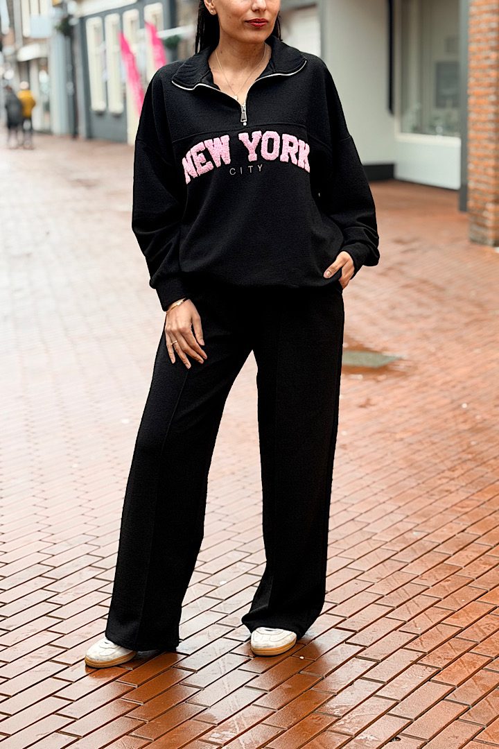 Dit vrolijke tweedelige New York-pak geeft direct een sprankelende indruk. De zachte bouclé-look, kraag met de ritssluiting en de naad aan de voorkant van broek zorgen voor een verzorgde lijn. De teddy-lettering “New York” geeft een speels accent en sportieve twist.