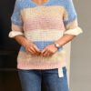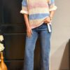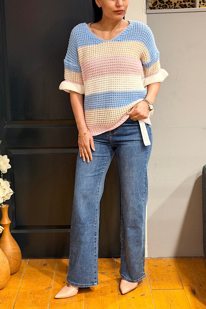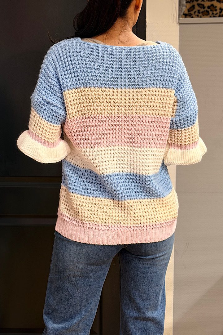 Lichtgewicht opengewerkte knit top met een subtiel streeppatroon in pastel- en neutrale tinten. De top heeft een V-hals, een relaxte pasvorm en 3/4 mouwen met ruffle detail voor een vrouwelijke touch. Perfect om te layeren en ideaal voor dagelijks gebruik.