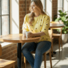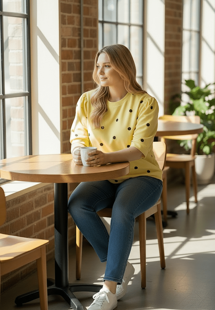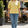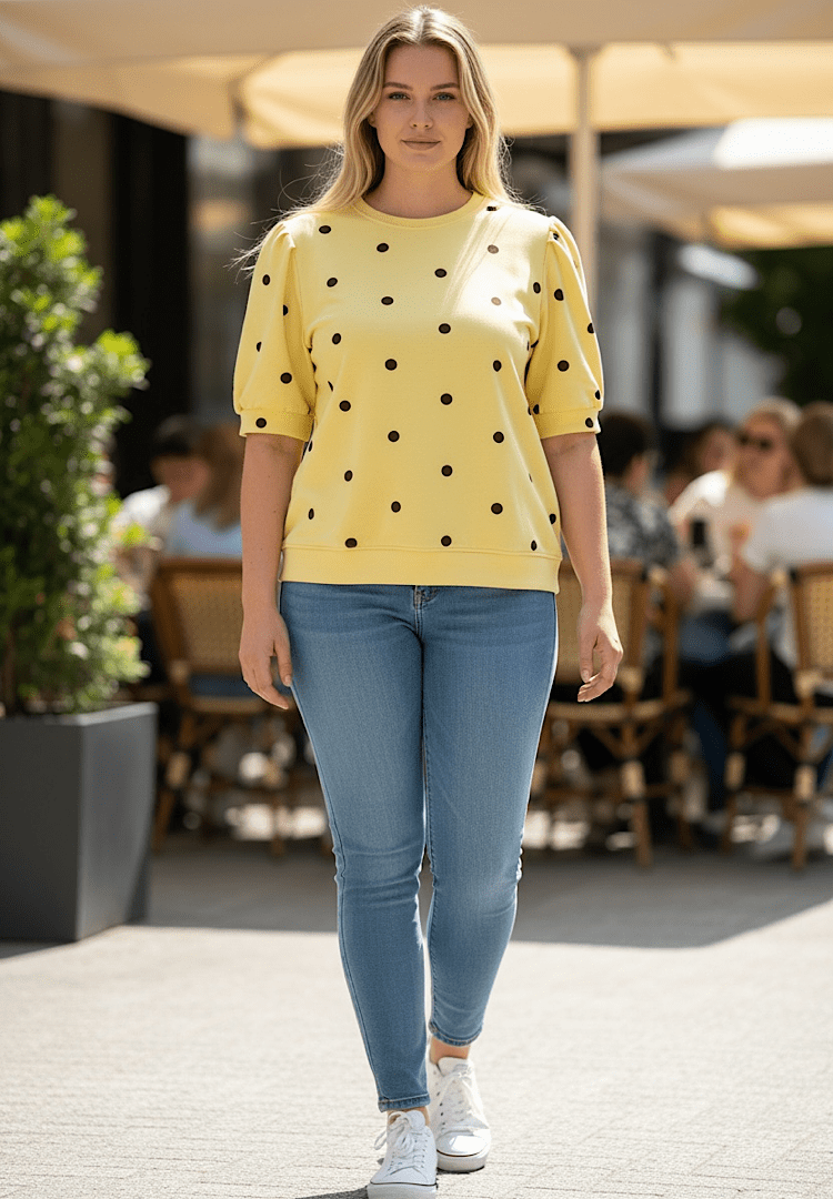 Stralend en speels: deze gele polkadot top is een absolute musthave! Dankzij de fijne stretch en de ruime pasvorm is deze top ideaal voor diverse figuren.