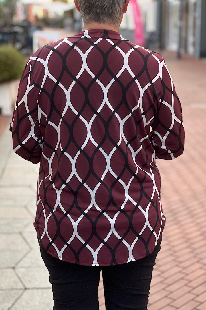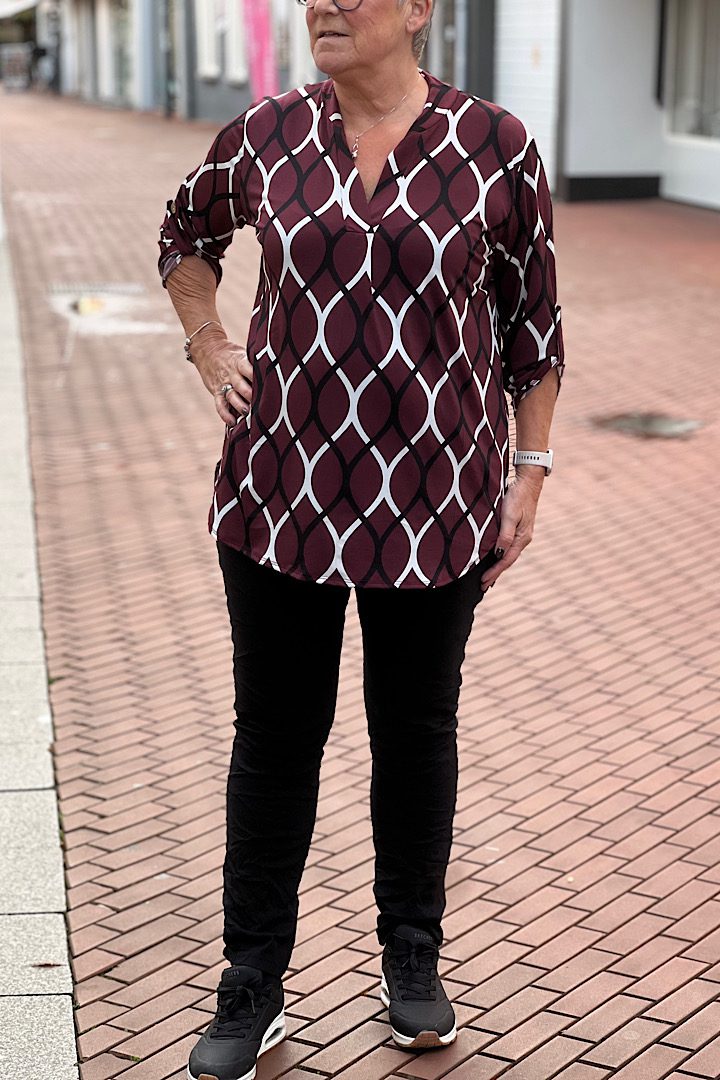 Detail: Deze travelstof blouse is voorzien van een platte kraag met een v-hals, driekwart mouwtjes met mouwophouder.
