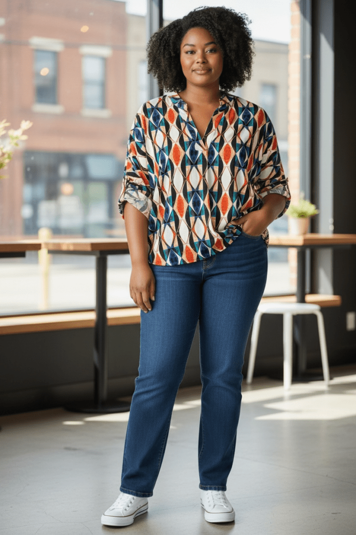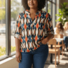 Detail: Deze travelstof blouse is voorzien van een platte kraag met een v-hals, driekwart mouwtjes met mouwophouder.