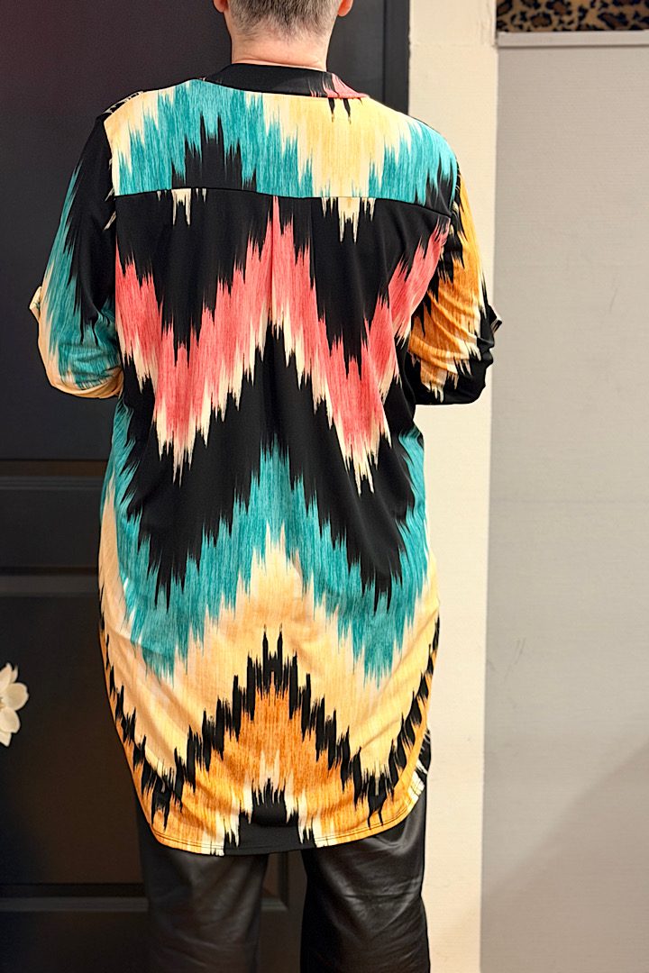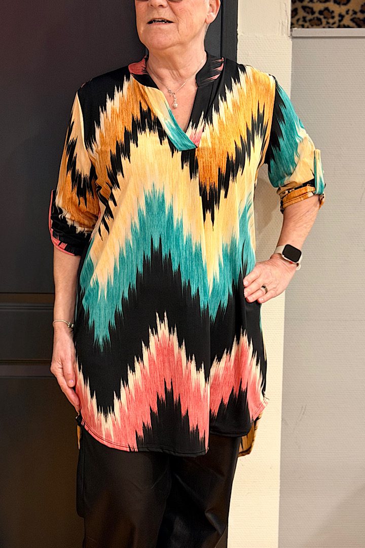 Detail: Deze travelstof tuniek is voorzien van een platte kraag met een v-hals, driekwart mouwtje met mouwophouder.