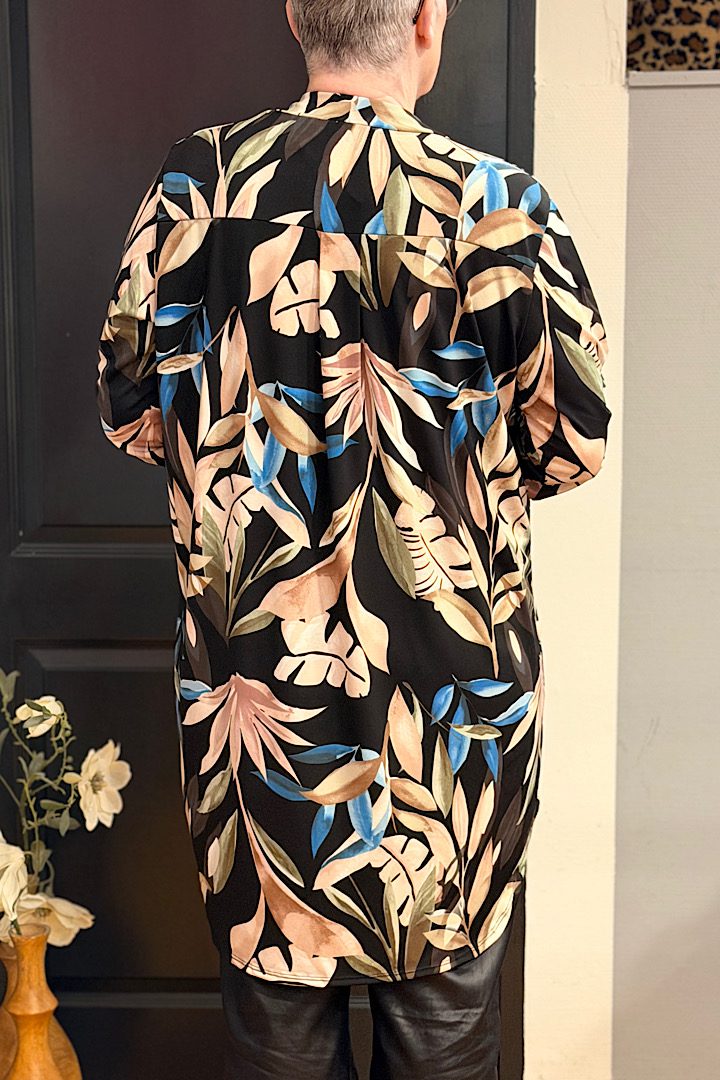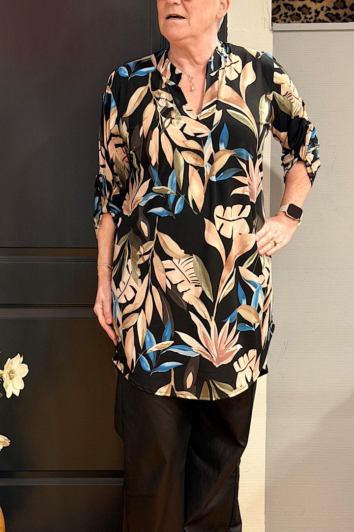 Detail: Deze travelstof tuniek is voorzien van een platte kraag met een v-hals, driekwart mouwtje met mouwophouder.