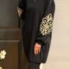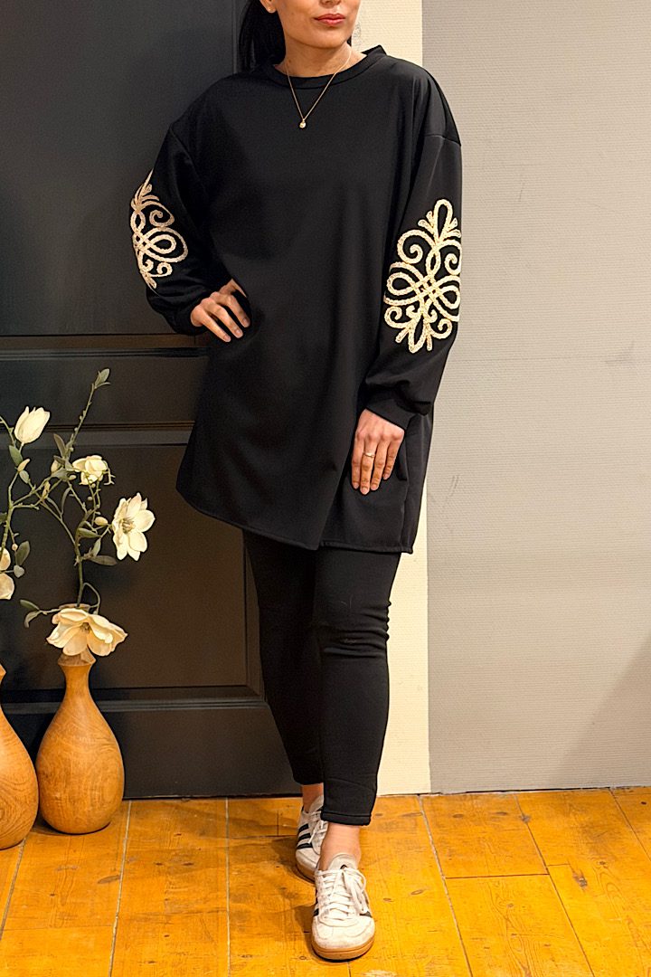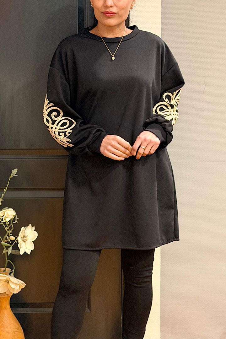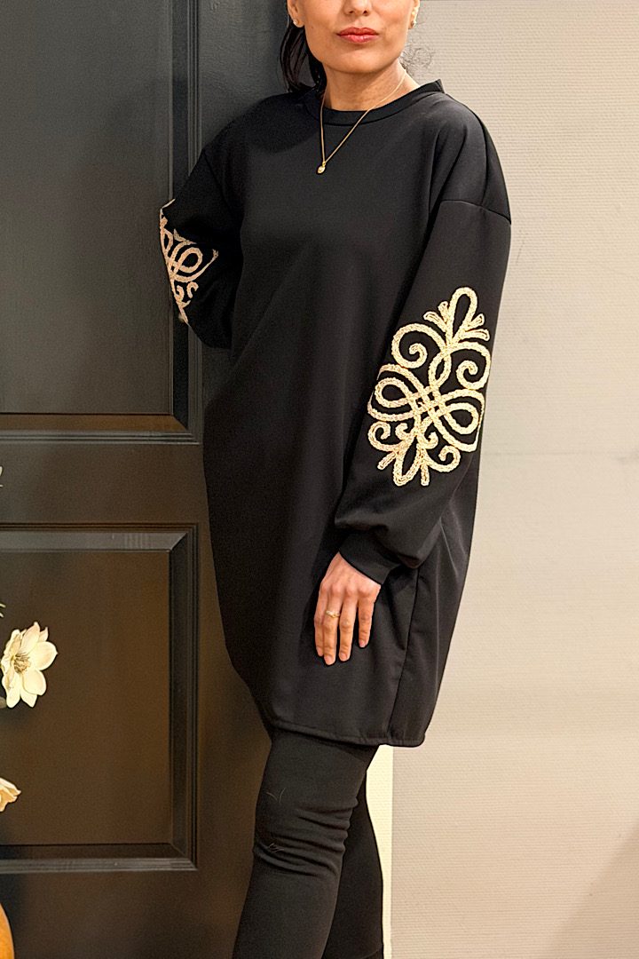 Comfortabel en stijlvol! Deze tuniek/jurk is gemaakt van een zachte, soepele sweatstof met stretch. De goudkleurige geborduurde bies op de mouwen zorgt voor een chique accent. Het model valt achter iets langer dan voor en is perfect te dragen als jurk of als tuniek op een strakke broek.