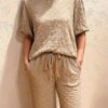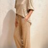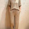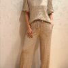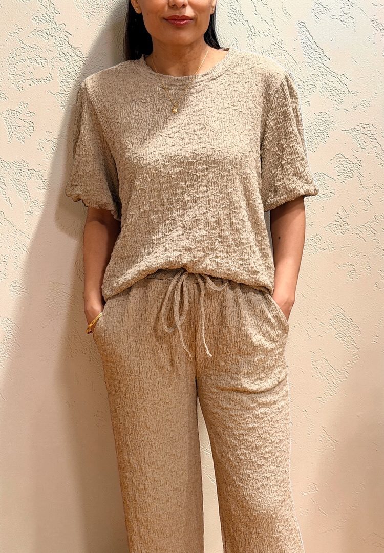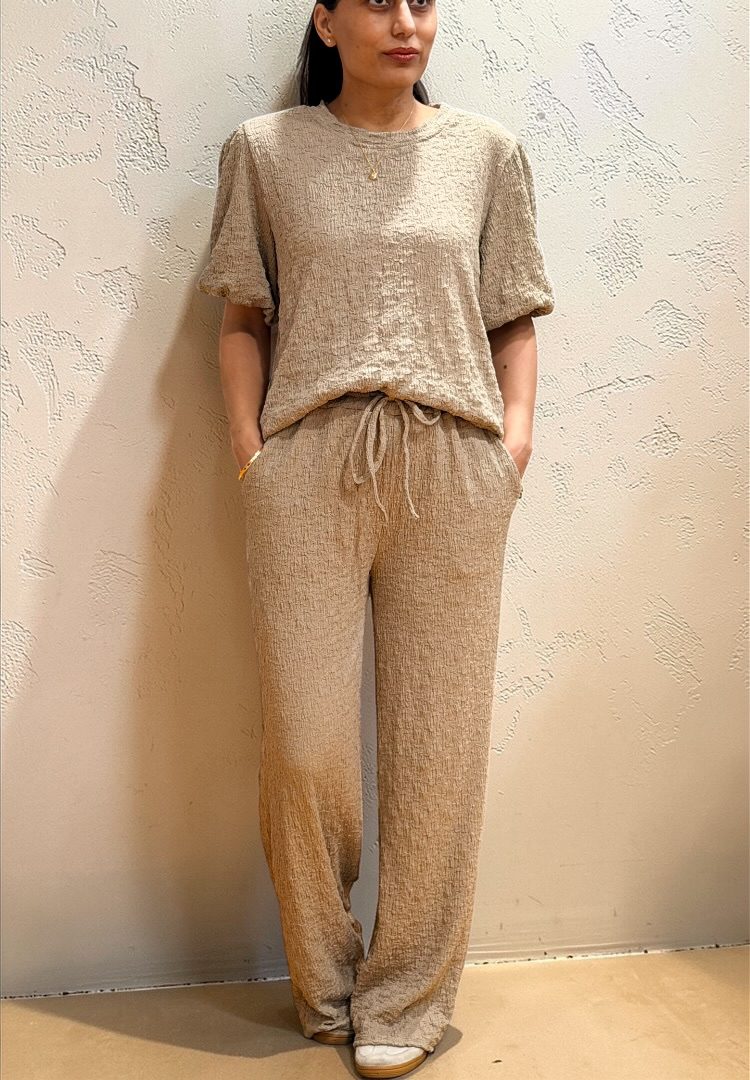 Stijlvolle set van luxe structuurstof met een perfecte balans tussen comfort en elegantie. De top heeft een ronde hals en gevoerde pofmouwen; de broek is voorzien van een elastische tailleband met koord.